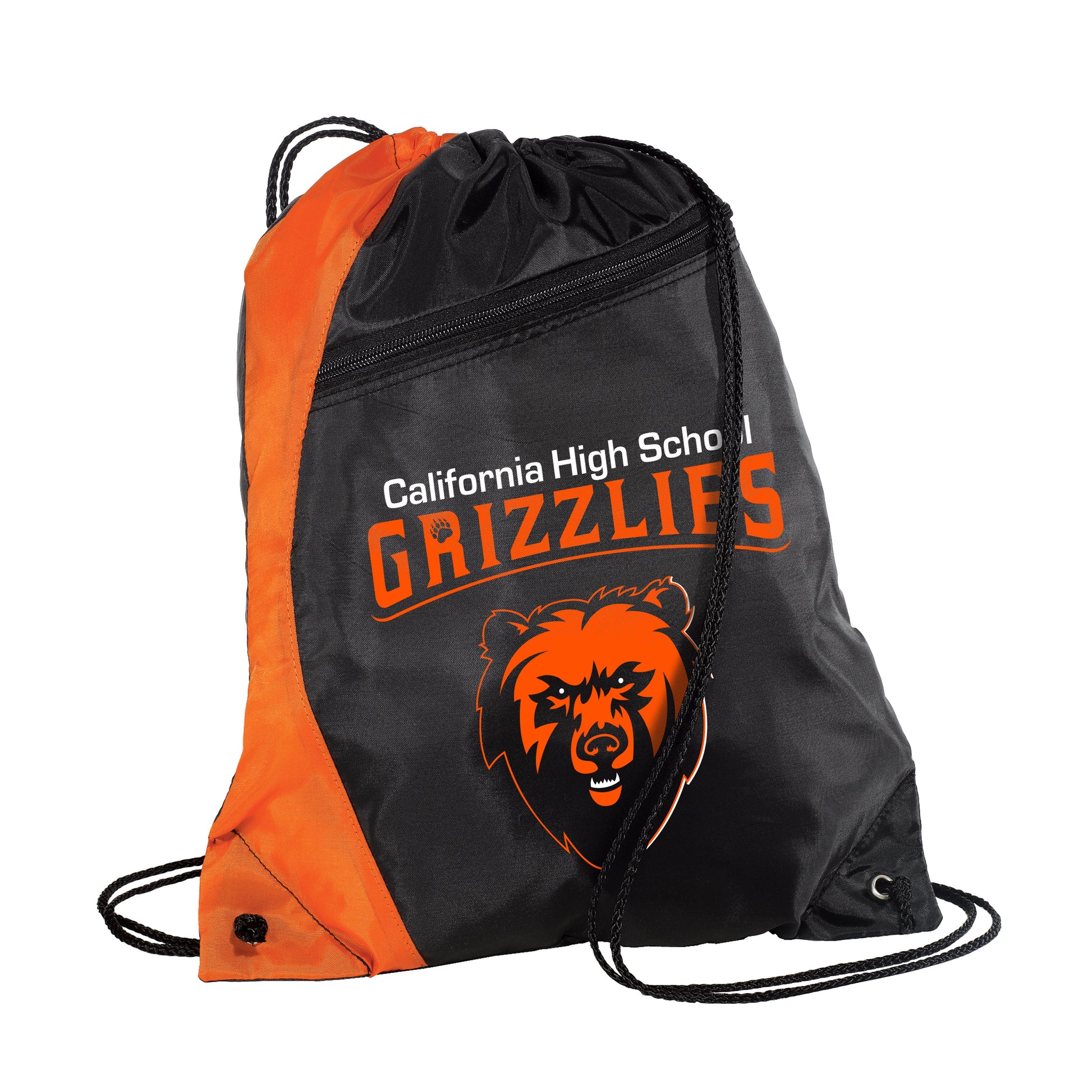 Color-blocking and an asymmetrical zippered front pocket give this cinch pack distinctive character.