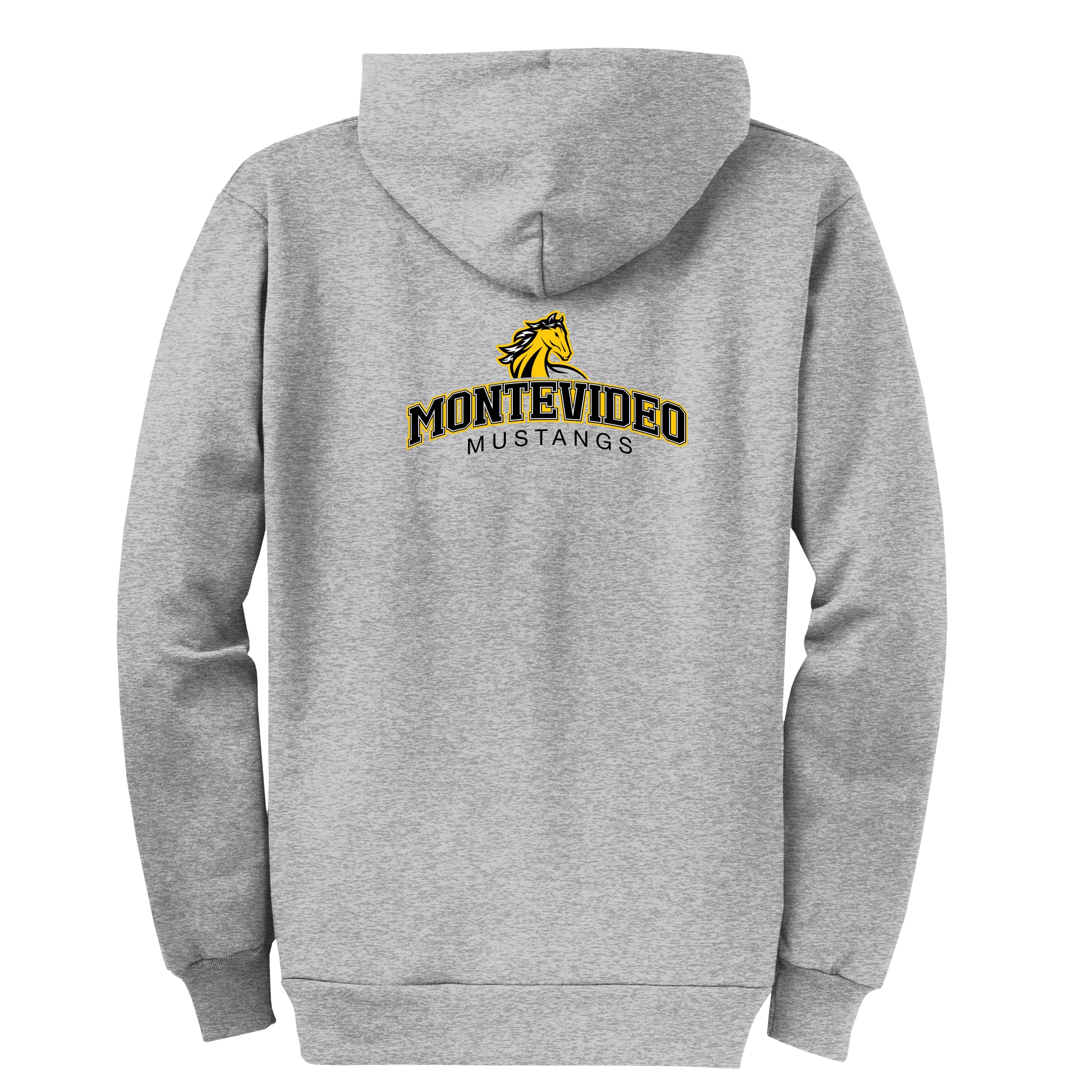 A timeless layer for every Mustang. Crafted from a soft 7.8-ounce 50/50 cotton-poly fleece, this zip-up hoodie features the Montevideo Classic logo for a clean, everyday look. Complete with a durable YKK zipper, roomy pockets, and a no-fuss hood, it’s built for comfort and school pride that lasts. A percentage of all sales will be donated to support Montevideo PTA.