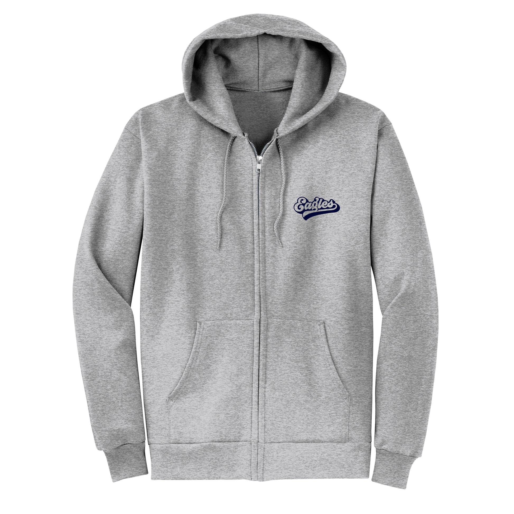 A throwback look with everyday comfort. The Retro Neil Armstrong Zip-Up Hoodie features our bold retro “Eagles” logo printed on the back, giving it a clean, classic front and a statement finish from behind. Made with a soft and durable 50/50 cotton-poly fleece blend, it’s warm without being heavy, with a full-length zipper for easy layering, ribbed cuffs and hem, and roomy front pockets. Designed for school days, spirit events, and everything in between, it’s a timeless way to show Eagle pride.