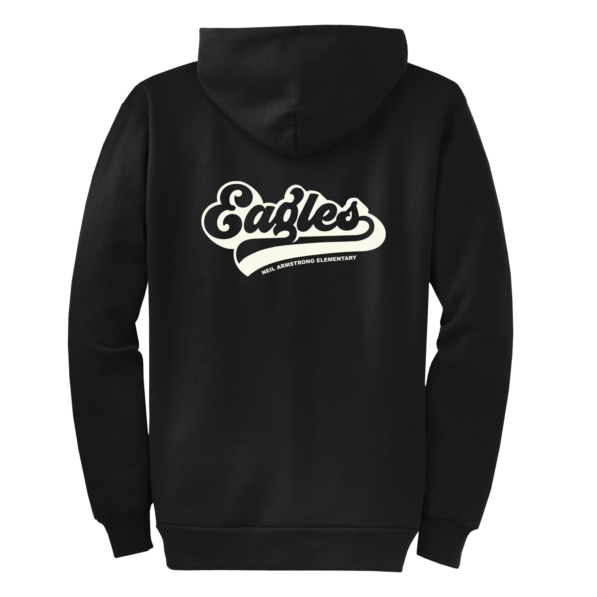 A throwback look with everyday comfort. The Retro Neil Armstrong Zip-Up Hoodie features our bold retro “Eagles” logo printed on the back, giving it a clean, classic front and a statement finish from behind. Made with a soft and durable 50/50 cotton-poly fleece blend, it’s warm without being heavy, with a full-length zipper for easy layering, ribbed cuffs and hem, and roomy front pockets. Designed for school days, spirit events, and everything in between, it’s a timeless way to show Eagle pride.