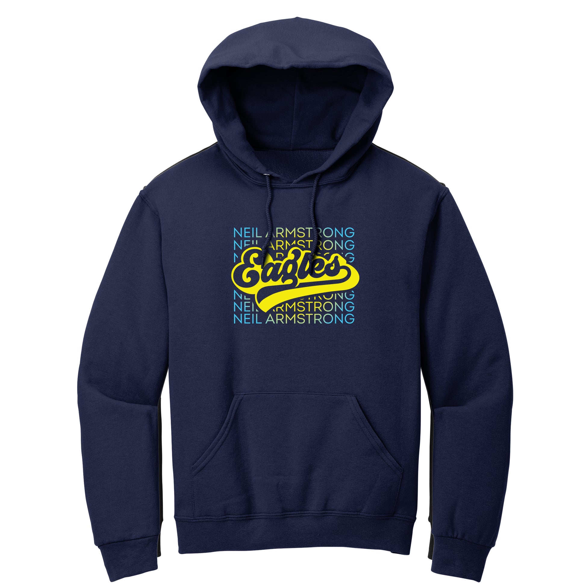 Brighten up your school spirit with the Neil Armstrong Sunburst Pullover Hoodie. Made with a 50/50 cotton-poly fleece blend, this hoodie is soft, warm, and built to last. Featuring a roomy front pocket, ribbed cuffs and hem, and a relaxed unisex fit, it’s perfect for layering on cooler days. A timeless pullover with a fresh Sunburst twist — designed for comfort, durability, and Eagle pride.