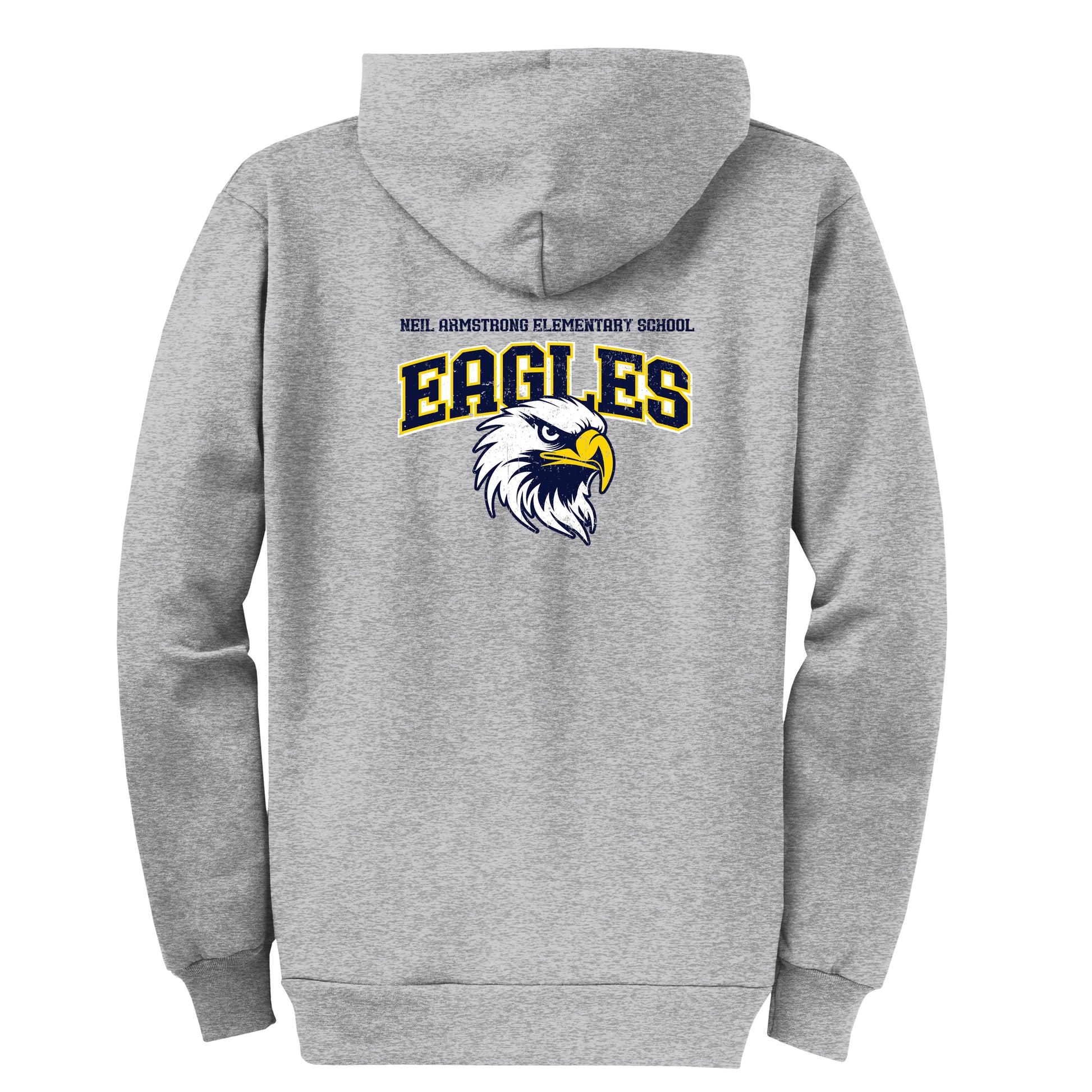 Classic spirit with a vintage edge. The Neil Armstrong Vintage Zip-Up Hoodie features the bold eagle logo and collegiate lettering printed on the back, giving it a clean, simple front and a statement finish from behind. Made with a 50/50 cotton-poly fleece blend, this midweight hoodie is soft, durable, and built for layering. The full-length zipper makes it easy to wear year-round, while ribbed cuffs, hem, and roomy front pockets keep it practical and comfortable. A timeless zip-up that carries Eagle pride everywhere you go.