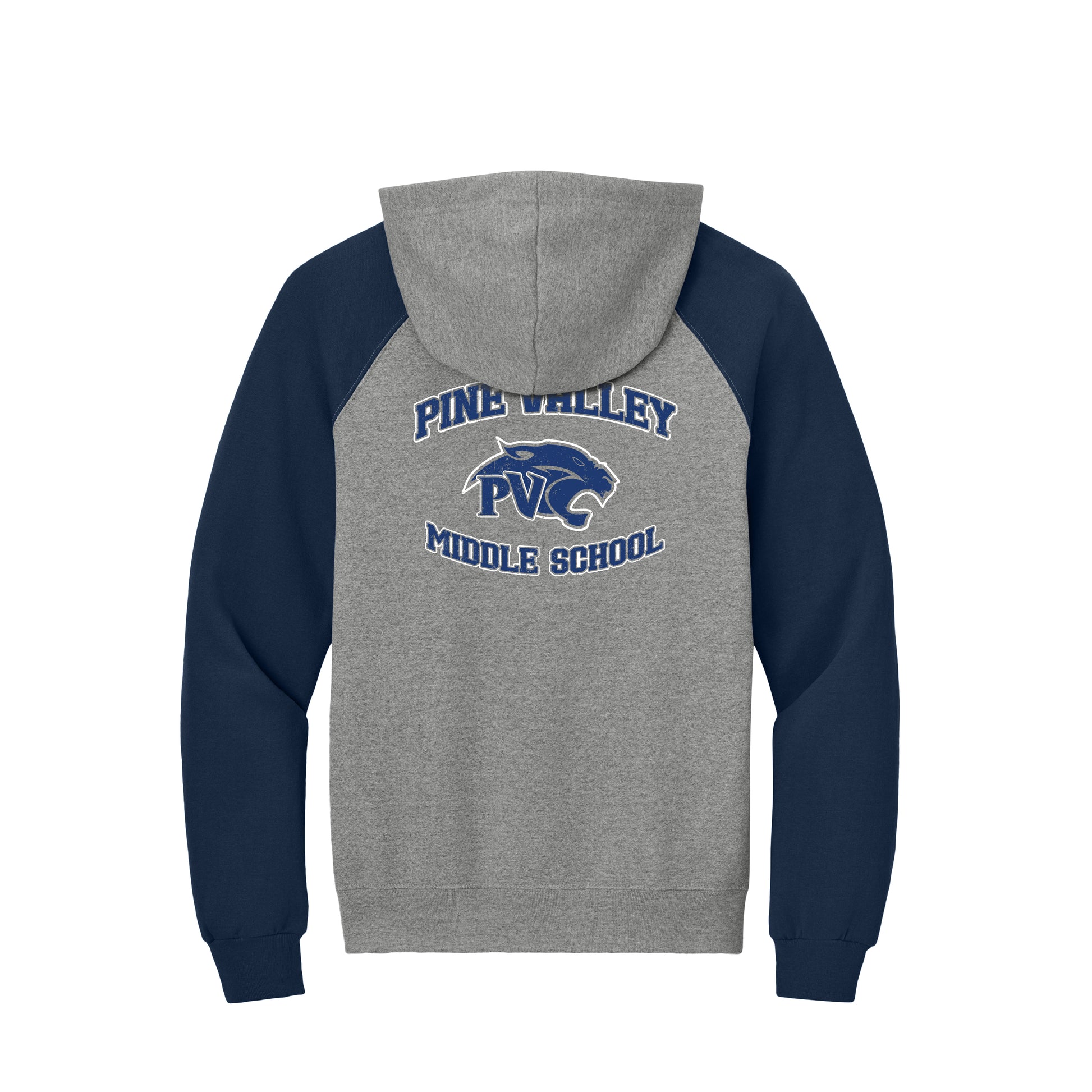 The Raglan Hoodie from the Vintage Collection combines a retro-inspired blue and grey colorblock design with a faded PV logo up front and a classic Pine Valley Middle School graphic on the back. Made from soft, pill-resistant 8-ounce fleece, it’s a standout in every way.